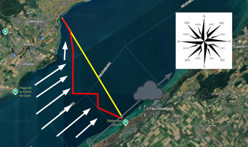 In der Ferne, am gegenüberliegenden Ufer, schauen wir einer Wolke beim Abregnen zu. Sie zieht schnell von Südwest nach Nordost zusammen mit den Wellen den See hinunter und schiebt starke Windböen vor sich her, die wir ebenfalls abkriegen und meine Bemühungen, den Kurs zu halten, zusätzlich sabotieren. Ausserdem sorgen beide Kräfte für Abdrift, der mit weiteren Kurskorrekturen entgegengewirkt werden muss. Wir entscheiden, weiter nach Süden zu fahren und so hinter die Wolke zu kommen.