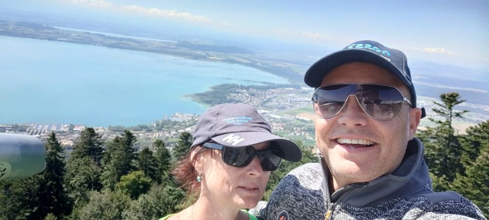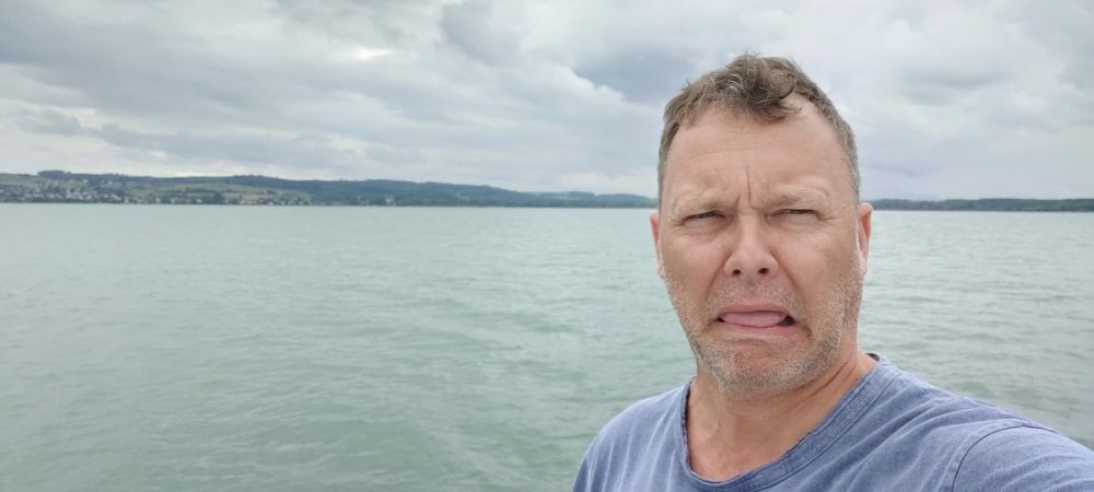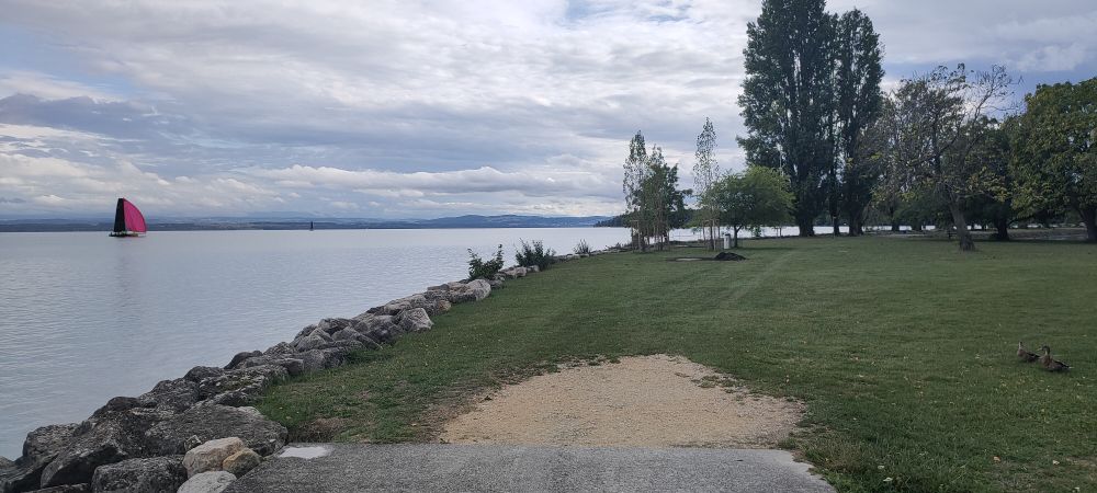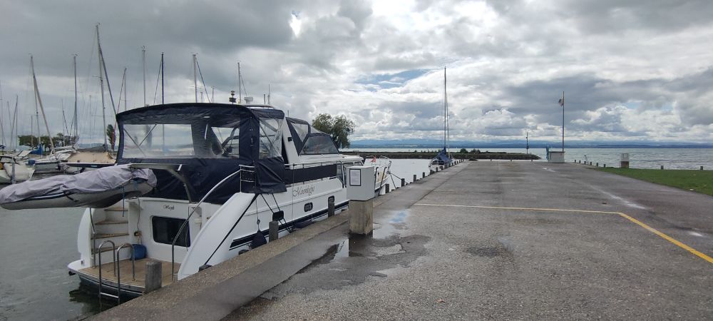 Beim Anker einziehen merke ich, wie leicht sich dieser vom Grund löst. Bei starkem Wind hätte dieser nie gehalten, die Entscheidung ist also schon mal nicht falsch. Die Überquerung nach Vallamand dauert 20 Minuten. Während der Fahrt bereitet Lydia alles vor, damit wir in Rekordzeit anlegen festmachen, alle Verdecke und Planen wettersicher befestigen, uns umziehen und mit einem gepackten Rucksack gen Avenches abdüsen können. Mit unseren eScootern umrunden wir den See und treffen früh genug ein, um uns im Duschbereich frisch machen zu können. Lydia hat alles Notwendige eingepackt, so dass wir uns kurz darauf ausgehfein bei Käthi am Camper einfinden können.