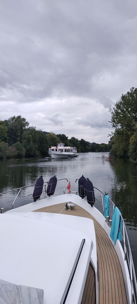 Wir ziehen unseren Anker ein. Langsam holen wir den Vorsprung von Robi auf, bis wir im Broyekanal freundlich vorbeiziehen.