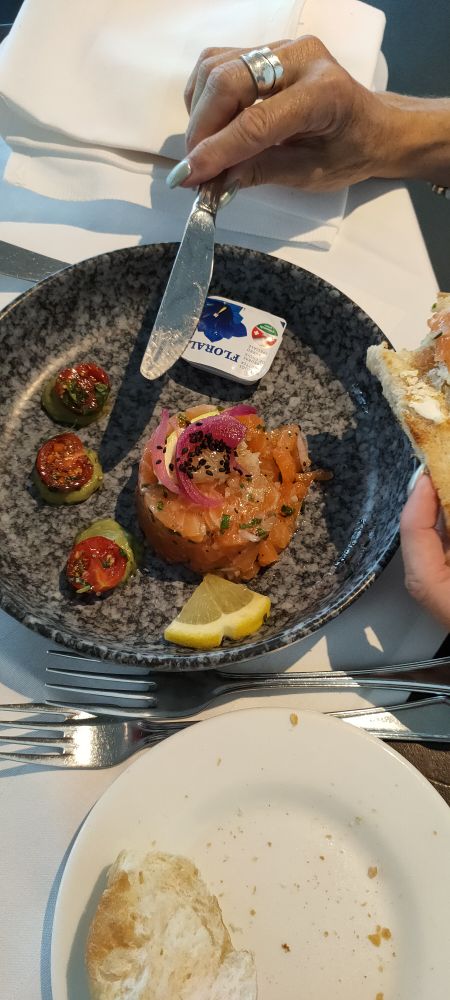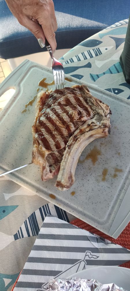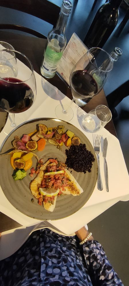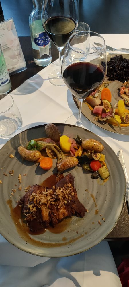 Ein leckeres Lachstartar eröffnet das heutige Abendmahl, gefolgt von etwas zu garen Doradenfilets für Lydia und einem ebenfalls zu lange geschmorten Schweinerückensteak für Patrick. Die Besatzung ist aber immer charmant und der Wein, ein lokaler Gamaret aus dem Barrique, überzeugend. So geht der Abend alles in allem gut aus.