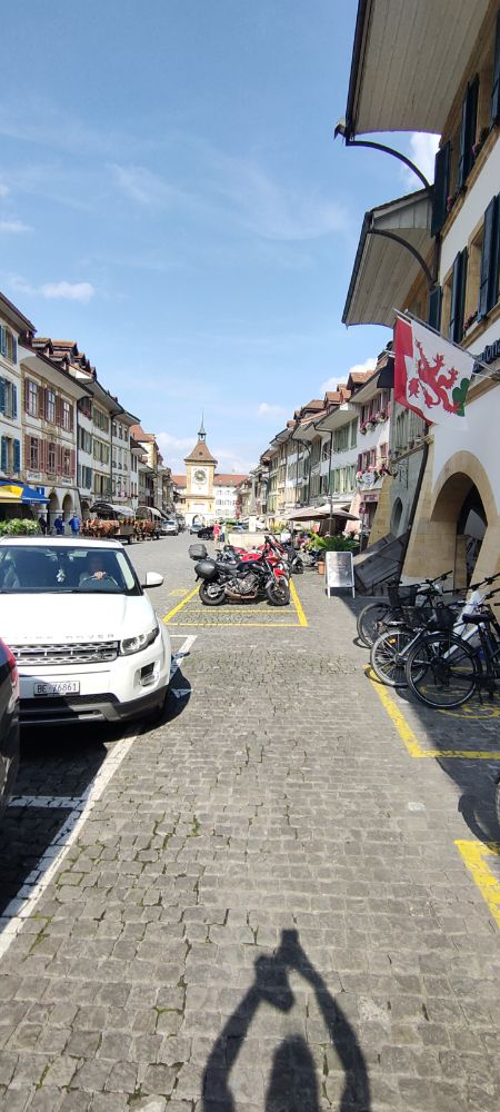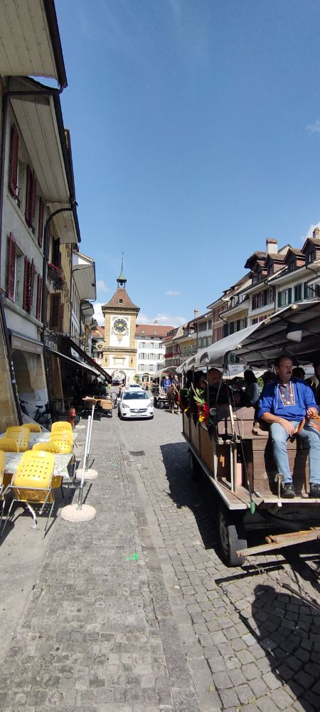 Es ist viel los im Murtener Stedtli. Jedes Restaurant ist gut besucht, der Touristenzug ist unterwegs, 2 Pferdegespanne ziehen an uns vorbei, die Töfflibuebe knattern auf ihren Mopeds durch die Strassen und ein bunt gekleideter Tross von Männern feiert vermutlich Junggesellenabschied.