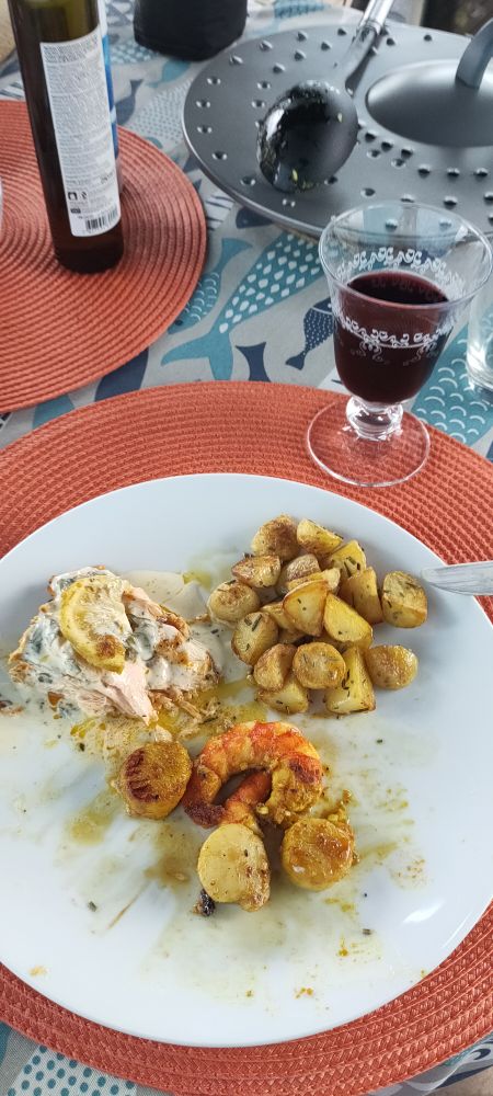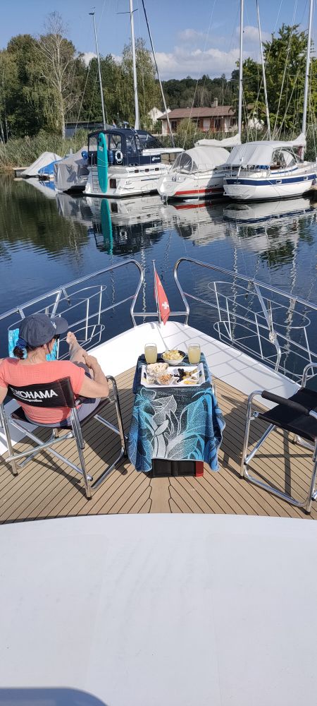 Käthi reserviert für uns vier einen hübschen Platz für’s zNacht in der Camping-Beiz. Danach hole ich sie per Beiboot im Hafen ab. Lydia hat bei unserer Ankunft schon das nächste Plättli im Arsenal.