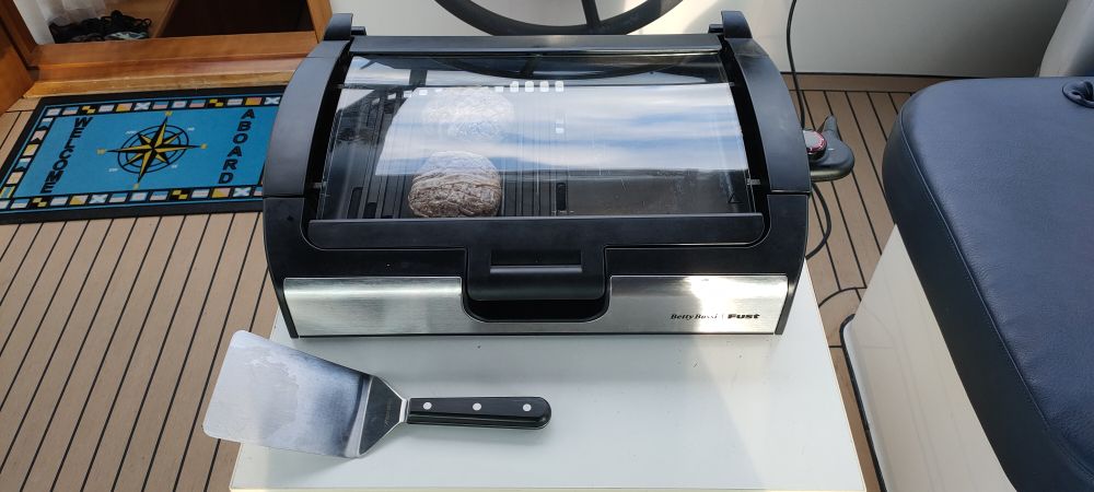 Aber zurück zu den zNacht-Vorbereitungen. Heute gibt es nochmal Riesenkrevetten und Jakobsmuscheln, ergänzt mit einem schönen Lachsfiletstück vom Grill. Abgerundet wird das Menü mit Bratkartoffeln und einem Tomaten-Mozzarella-Salat. Dazu ein kräftiger Zinfandel-Rotwein aus dem kalifornischen Nappa-Valley. So geniessen wir unser Festmahl, während draussen heftiger Regen die Geräuschkulisse der Autobahn übertönt.
