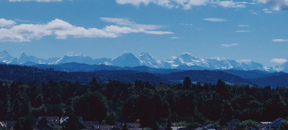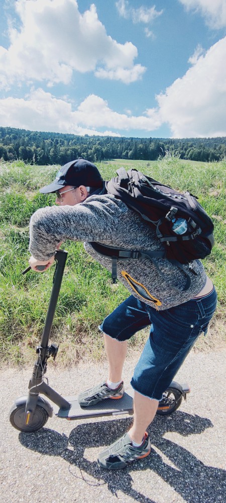 Danach beginnt unser eScooter-Roadtrip. Zuerst auf dem Bergkamm Richtung Bielersee, dann abwärts durch Waldstücke, vorbei an Weiden, Feldern und kleinen Ferienhäuschen, die hier weit verbreitet sind.