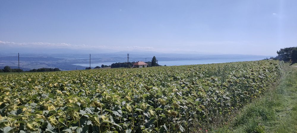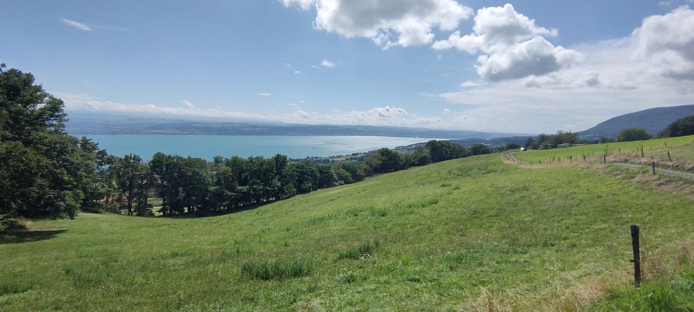 Und auch diesen werden wir nicht zu Fuss unternehmen. Dafür haben wir unsere eScooter mitgebracht und beim Restaurant zurückgelassen. Der grösste Teil der Strasse ist asphaltiert und um die Schlaglöcher herum können wir mit unseren 2 Rädern besser manövrieren als mit 4. Die Strecke zieht sich über 20 km hin und überwindet 1000 Höhenmeter mit einem mehr oder weniger gleichmässigen Gefälle. Nur bei den gelegentlichen Weiderosten müssen wir absteigen, um nicht zirkusreife Überschläge zu fabrizieren. So geht es vorbei an Feldern, Weiden und Wäldern, an putzigen Ferienhäuschen und an allerlei Getier wie Kühen, Esel und Pferden. Dazwischen findet sich immer wieder ein Aussichtspunkt über den Neuenburgersee.
