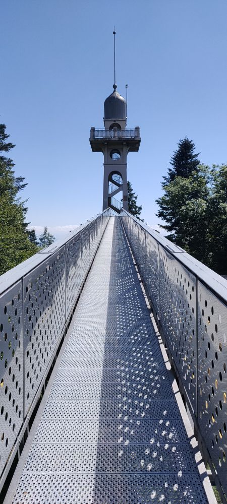 Wir klettern auf den Aussichtsturm und geniessen den Blick über die 3 Seen und die dahinter aufragenden Schweizer Alpen.