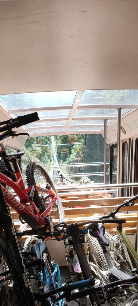 Am Nachmittag machen wir unsere eScooter und einen Rucksack mit herbstlichen Klamotten klar. Damit scootern wir zur Talstation der Standseilbahn auf den 1180 Meter hohen Chaumont, dem Hausberg der Stadt Neuchâtel. Die Bahn ist eine Art Tramwaggon, der auf Schienen an einem Stahlseil den Berg hochgezogen wird. Der Wagen ist gut besetzt mit Downhill- Bikern, die ihre Rennmaschinen vor unserer Sitzbank aufgestapelt haben.