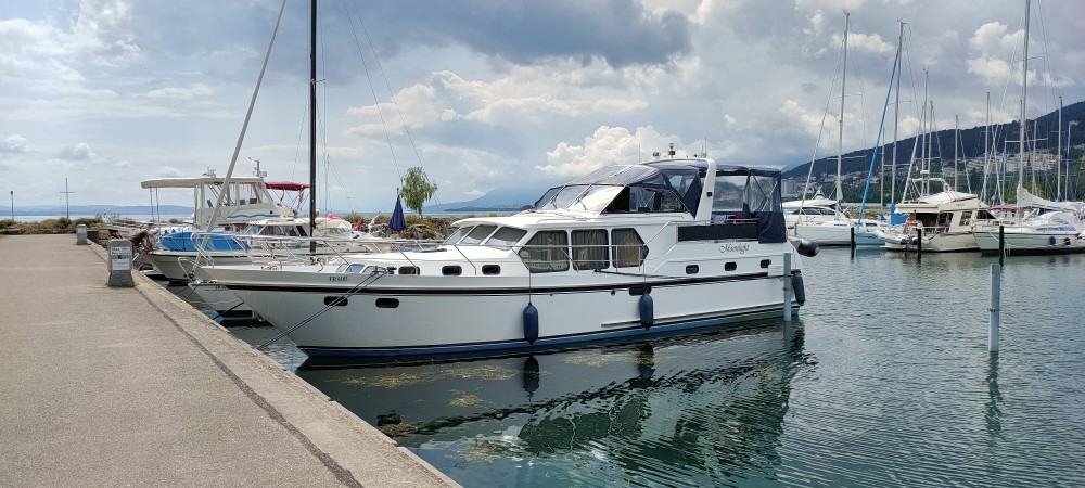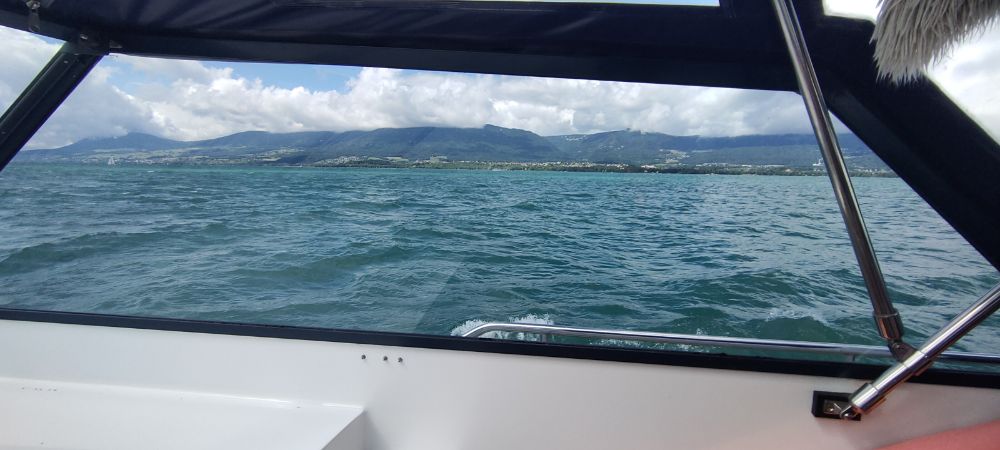 Unser Ziel ist deshalb der Hafen von Auvernier, südwestlich der Stadt Neuchâtel gelegen und ziemlich genau 1 Stunde Fahrt vis-à-vis von unserem Standort entfernt. Der See ist aufgewühlt, Wellen schlagen gegen unseren Rumpf und wegen des kühlen Windes behalten wir die Blachen auf dem Achterschiff geschlossen.
