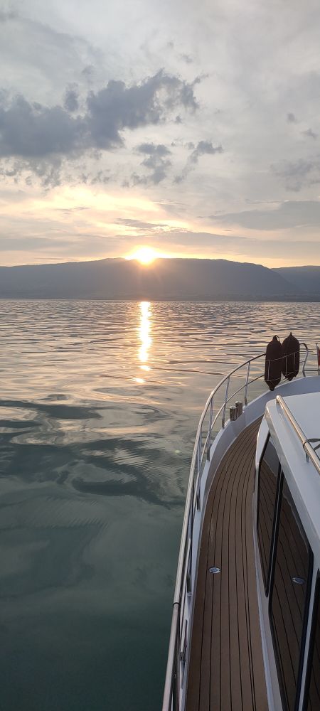 Gegen Abend überqueren wir den See wieder in die entgegengesetzte Richtung und machen an unserem Hafenplatz fest. Das bedeutet übrigens eine garantierte Landstrom-Verbindung, was bei unseren gebeutelten Batterien durchaus von Vorteil ist.