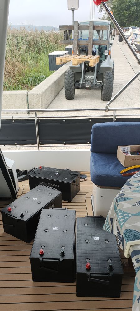 Die Kollegen kommen zu zweit per Pneulader angefahren, mit dem sie eine Palette transportieren. Darauf liegen hübsch aufgereiht 4 Mastervolt Bleigel-Batterien mit je 200 Ah Kapazität bei 12 Volt. Stückgewicht 70 Kg. Die Palette wird durch die blachenfreie Seite auf Oberdeck-Niveau gehoben, so dass die Batterien einigermassen komfortabel an Bord genommen werden können.