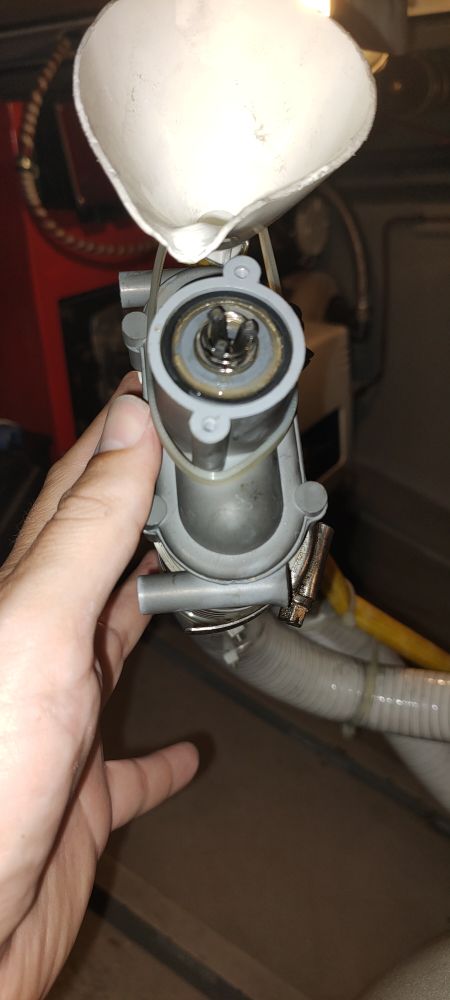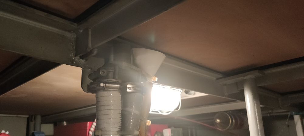 Nebenher macht er mich auf ein Belüfterventil aufmerksam, welches Unterdruck im Kühlwassersystem verhindert. Dieses hat einen Überlauf, über den gelegentlich ein paar Tropfen See-Wasser in einem Kanister aufgefangen werden. Merkwürdig, der Kanister ist voll, wo ich den doch sonst maximal 1x im Jahr leeren muss. Er schärft mir ein, dass da viel zuviel Wasser rausläuft, dass das Ventil defekt sei und ersetzt werden muss. Ich mache mir dazu eine gedankliche Notiz, während ich den Kanister leere.