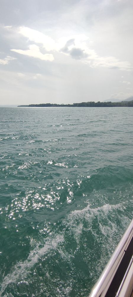 Im Neuenburgersee begrüsst uns eine steife Brise mit Wellen von der Seite. Unser Ziel ist Saint-Blaise am untersten Nordwest-Zipfel. Warum unten? Weil die Abflussrichtung von Südwest nach Nordost ist und Wasser auch in der Schweiz selten den Berg hochfliesst.