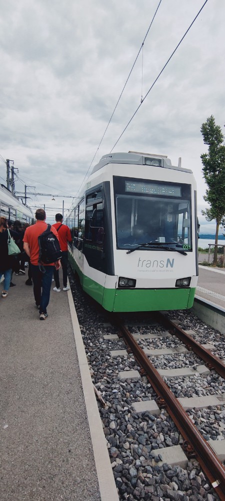 Wir nutzen ein regenfreies Zeitfenster für einen kleinen Ausflug in die Kantons-Hauptstadt. Eine Tram namens «Littorail» fährt in direkter Nachbarschaft zum Hafengelände nach Neuchâtel. Allerdings mit Hindernissen. Auf halber Strecke bleibt die Karre an einer Station länger stehen als notwendig. Irgendwann tritt der Schofför aus seinem Kabuff und erklärt, dass alle aussteigen sollen. Wenige Minuten später fährt eine zweite Tram auf dem Geleise daneben ein, in die wir einsteigen.