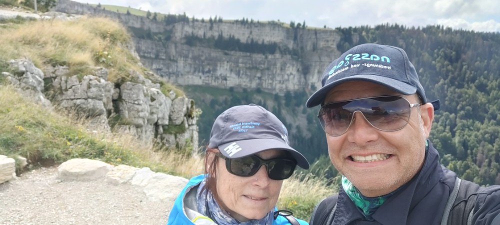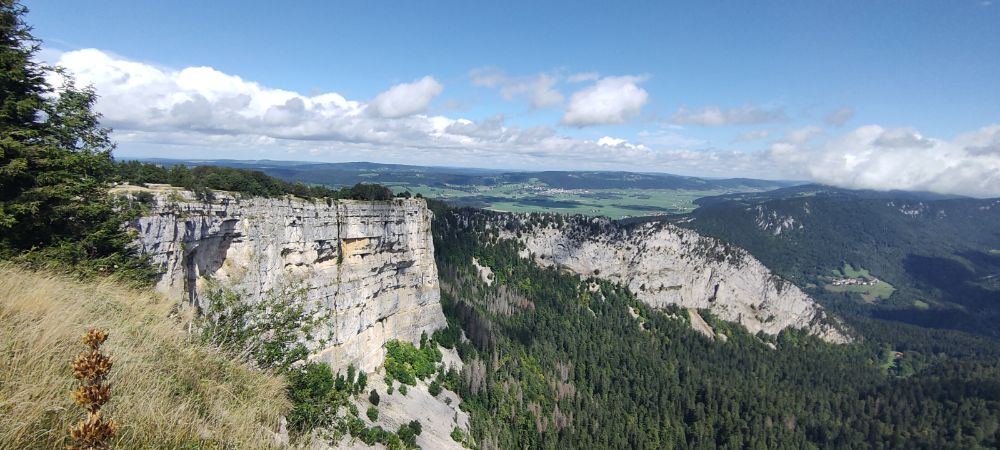 Darunter führt ein Tal nach Nordosten in Richtung Neuenburger- und Bielersee. Auch der Chaumont, auf dem wir vor ein paar Tagen waren, ist zu erkennen. Die Sicht ist erfreulicherweise gut, da die Wolken ein Stück höher dahingleiten. Wir wandern an den Steilwänden entlang nach oben zur Gipfelhöhe. An mehreren Stellen können wir ganz dicht an den Abgrund treten und Fotos aufnehmen. Nichts für Menschen mit Höhenangst. Also wie meiner einer zum Beispiel. Trotzdem gelingen uns ein paar hübsche Aufnahmen. Wir verweilen rund 2 Stunden in der Umgebung, bevor wir uns an den Abstieg machen.