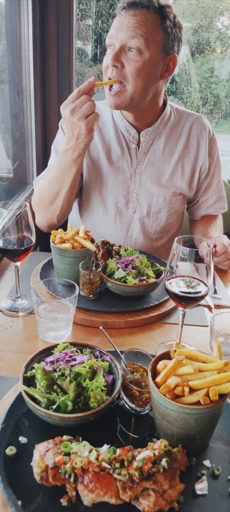 Serviert werden kreolische Spezialitäten. Wir starten mit 2 Caipirinhas, steigern uns zu einem angebratenen Thunfisch-Carpaccio, erhöhen auf niedergegarte Hähnchenkeulen mit Salat und Fritten und schliessen mit einer gebratenen Ananas an karamelisierter Salzbutter mit Vanilleeis ab. Dazu ein köstlicher Neuenburger Gamaret-Garanoir-Assemblage aus dem Barrique. Die Bedienung ist sehr charmant und das Essen ein Traum. Wir fühlen uns rundherum wohl.
