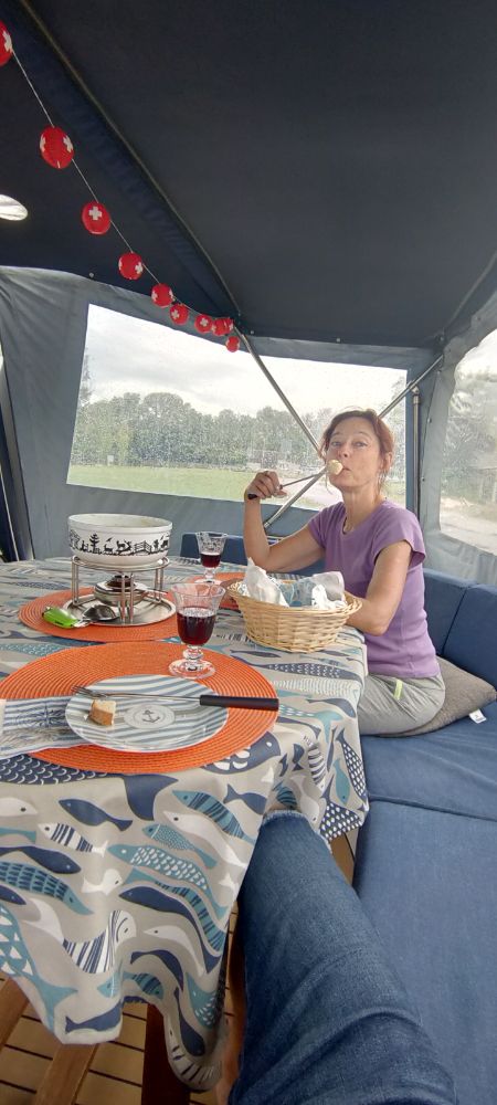 Mit den Trottis im Regen nach Vallamand zurückfahren ist im Regen keine erbauliche Erfahrung. Deshalb hat Käthi bereits im Vorfeld Campingfreunde organisiert, die uns mit ihrem Auto zurückfahren werden. Wir sind sehr dankbar für dieses noble Angebot. So kommen wir beinahe trocken in unserer Blechhütte an, reif für’s Bettchen nach diesem ereignisreichen Tag.