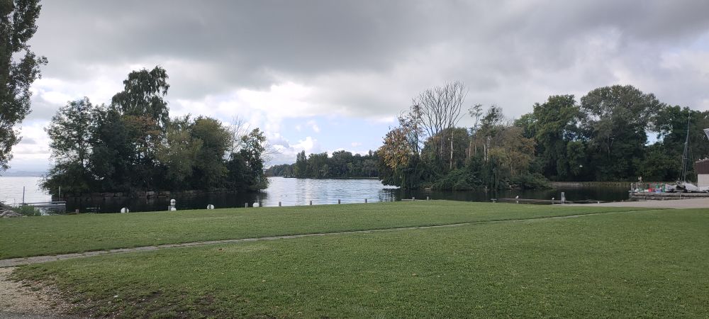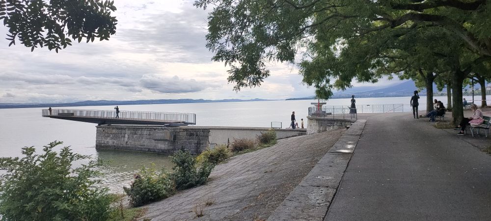 Später erfahren wir, dass in der Tiefgarage unter der Place Pury ein Fahrzeug in Brand geraten ist. Es wird extra und in Kursivschrift darauf hingewiesen, dass es sich um kein Elektrofahrzeug gehandelt habe. Also ein Verbrenner, im wahrsten Sinne des Wortes. Das Feuer konnte zwar schnell gelöscht werden, aber wegen der Gefahr einer beeinträchtigten Statik dürfen weder Autos noch die Littorail diesen Bereich überfahren, bis die Untersuchungen abgeschlossen sind. Von der Tramstation zum Schiff spazieren wir durch eine kleinen Teil des Parks von Auvernier, der sich über 1.5 km am See entlang ausdehnt.