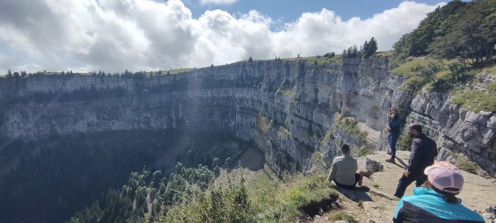 Dann Aufbruch, wir marschieren ein paar hundert Meter nach Norden und kommen direkt an’s Ziel unseres Ausflugs, dem Felsenkessel Creux du Van. Der etwa 1 km durchmessende Halbbogen aus 200 Meter hohen, steil abfallenden Felswänden ist durch Erosion und Gletscherbewegung in der letzten Eiszeit entstanden und ist ein beliebter Ausflugsort. Auch heute sind zahlreiche Besucher unterwegs, obwohl erst Freitag ist.