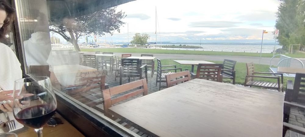 Bis plötzlich starke Windböen einsetzen. Innerhalb einer Minute ist die gemütliche Stimmung verflogen. Alle eilen in’s innere des Restaurants. Wir und ein paar andere Gäste helfen der Belegschaft, die Markisen einzuziehen, Sonnenschirme einzusammeln und Tischutensilien nach drinnen zu befördern. Robi ist mit Käthi zu ihrem Camper geeilt, um dort das Gleiche zu tun. In der Zwischenzeit setzt Regen ein. Wir klopfen uns innerlich auf die Schulter, dass wir unsere Schiffe zeitig in den Häfen versorgt haben.