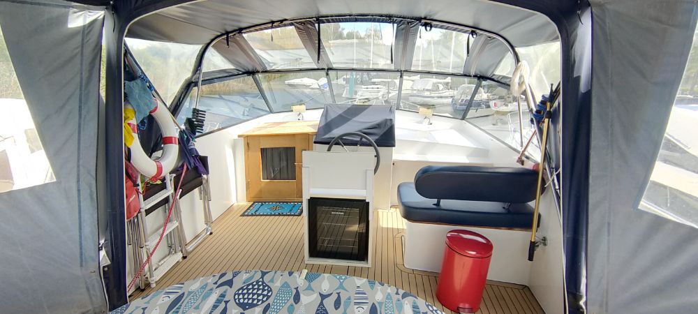 Bei der Einfahrt in Saint-Blaise steigt die Spannung, weil es hier nur 3 Plätze gibt, in die unser Eisenkahn reinpasst. Glück gehabt, einer davon ist frei. Mit dem Bug voran schlüpfen wir hinein und seilen uns rundherum fest an. Zeit für einen Hafentrunk. Notabene bei geschlossenem Verdeck, weil anders als in unserem Hafen zieht hier der Wind voll durch.