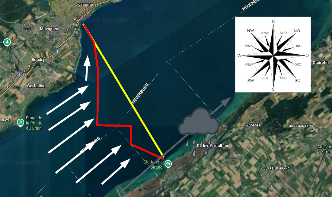 Gegen Mittag tut sich ein trockenes Wetterfenster auf. Leinen los, wir legen ab. Mit dem Wind im Rücken setzen wir Kurs auf den Broye-Kanal. Im Nordosten, weit hinter dem See, zieht eine Wolkenbank ihren Regenschleier hinter sich her.