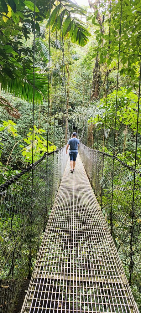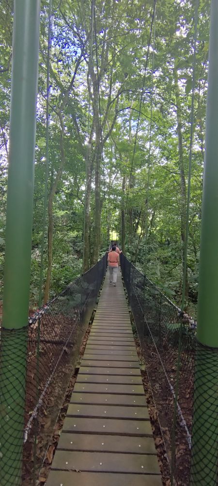 Wir überqueren den Damm des Arenalstausees und biegen scharf rechts ab, um den Hängebrückenpark «Mistico Arenal» zu besuchen. Der Name ist Programm, auf einem ca. 3.5 km langen, befestigten Rundpfad durch den Dschungel werden Schluchten auf bis zu 100 m Länge und 50 m Höhe überquert. Die Brücken schaukeln leicht hin und her sowie auf und ab. Die Aussicht über die Baumwipfel der mächtigen Dschungelriesen ist phänomenal und durch die Gitterroste kann ein Blick in den Abgrund riskiert werden. Genau das Richtige für Leute mit einer gepflegten Höhenangst. Also wie mich zum Beispiel.