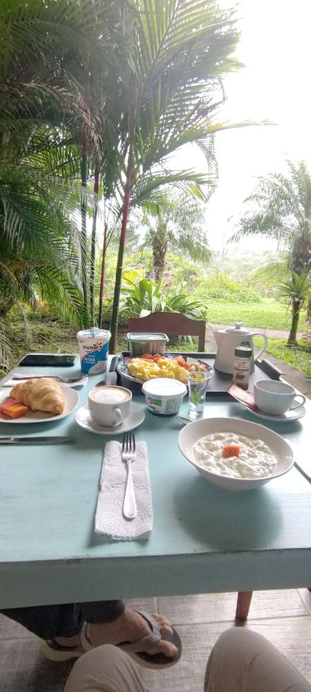 Unsere Frühstückbestellung wird geliefert. 1x Croissant und 1x Capuccino. Natürlich beides für Lydia. Ich bekomme die Kanne Schwarztee. Lydia steuert eine Obstplatte mit Papaya, Ananas und Banane bei. Für meine Diät gibt es einen geraffelten Apfel in Joghurt sowie zwei Scheiben trockenes Toastbrot. Ausserdem gönne ich mir ein Glas voll Lakto-Bazillen. Wir frühstücken bei angenehmen Temperaturen draussen auf der Veranda. Auch für die Kolibris ist das Frühstücksbüffet serviert.