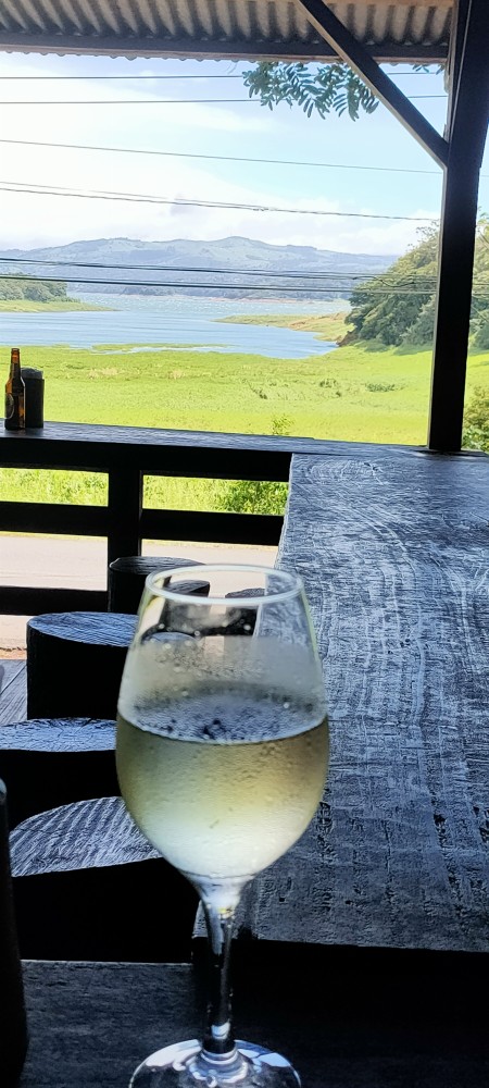 Wir haben Aussicht auf eine kleine Ausbuchtung des Arenal-Sees. Das Wasser ist ein Stück weit weg und man kann anhand der Schilfbewachsung sehen, dass es bei Höchststand bis zur Strasse reicht. Der Stausee erzeugt mit seinem Kraftwerk rund 60% des Strombedarfs von ganz Costa Rica. Dadurch sinkt der Wasserspiegel im Verlauf eines Jahres um rund 30 m, die in der Regenzeit wieder aufgefüllt werden.