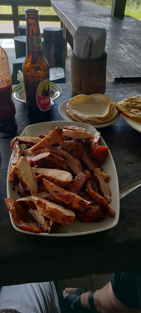 Zuerst nach Fortuna zum Bazillenhändler. In der Farmacia erstehen wir 3 Päckchen der begehrten Tierchen. Die ersten 100 Millionen werden unmittelbar danach im Auto weggeext. Im Ort wirbt das Restaurant Pollo Fortuneño mit seinen Hähnchen vom Holzfeuer-Grill. So richtig Appetit habe ich keinen, aber wir müssen endlich wieder unseren Rhythmus kriegen. Drinks und zwei halbe Hähnchen mit Beilagen sind bald bestellt. Si compañero, la cerveza ist für die Señora und der Schwarztee ohne Zucker für den bleichen Gringo.