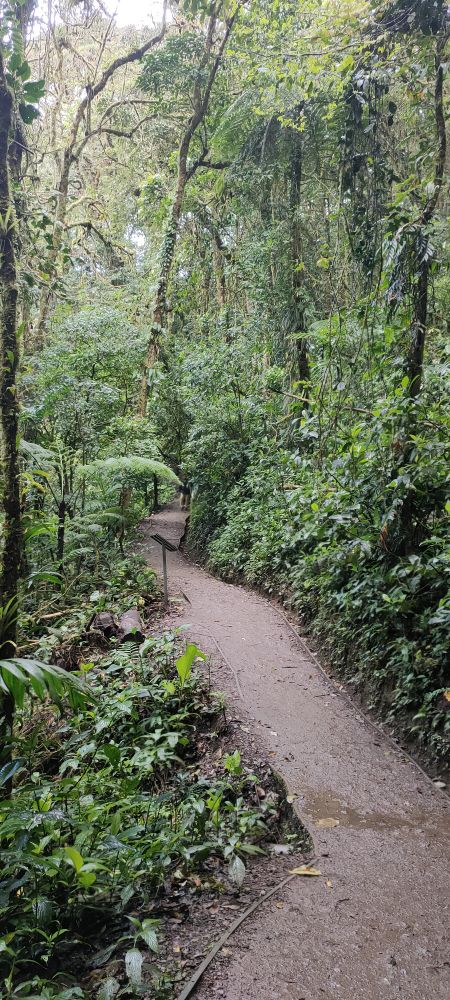 Zunächst steht eine 20-minütige Autofahrt zum Parkplatz des Monteverde Cloudforest Reserve an. Dann mit dem Shuttlebus zum Eingangsbereich. Dort treffen wir uns mit unserem Guide Olmán. Ein britisches Pärchen und zwei Japanerinnen gesellen sich ebenfalls zu unserer Gruppe. Gegen 7:30 Uhr geht es los und wir treten in den Nebelwald ein.