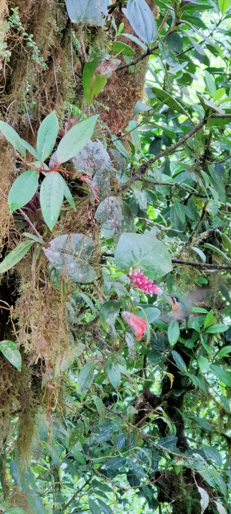Ferner erfahren wir von den Strategien der Pflanzen zum Thema Bestäubung. Manche bilden eine weiße Blüte, die im Nebel kaum auffällt und nicht die notwendige Aufmerksamkeit der Vögel auf sich ziehen kann. Deshalb bildet die Pflanze zusätzlich rote Blätter drumherum, quasi eine falsche Blüte. Lydia möchte gerade ein Foto einer solchen «Fake Flower» machen, als ein unhöflicher Kolibri – ohne vorher zu fragen! – ins Bild flattert. Na, findet Ihr ihn?