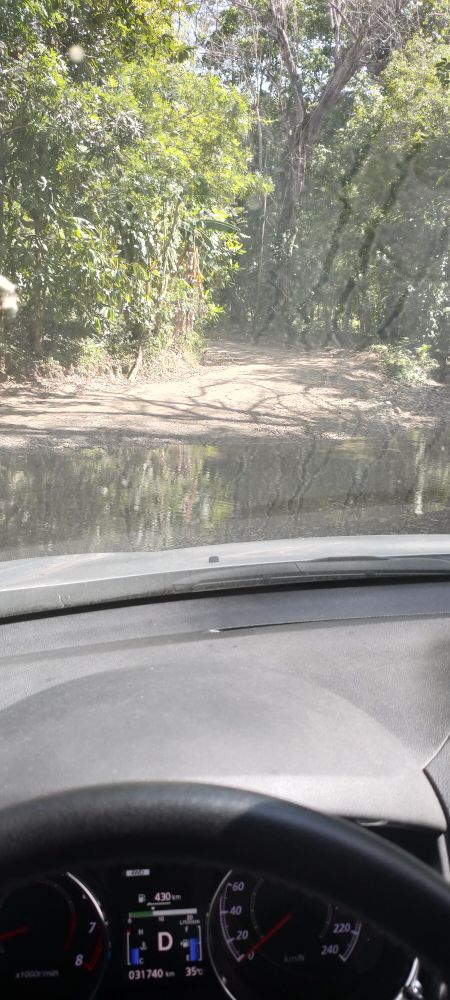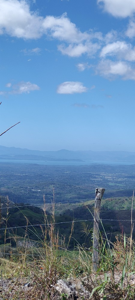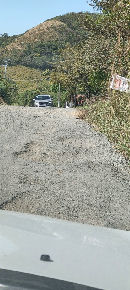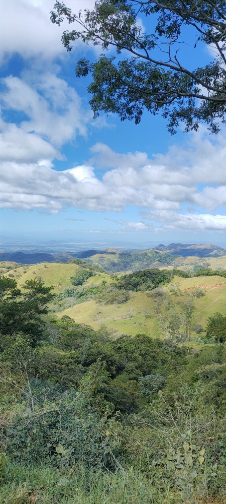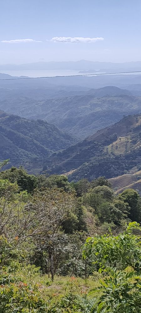 Naja, ganz so schlimm ist es dann doch nicht. Unsere Taschen sind schnell gepackt. Ein letzter sehnsüchtiger Blick über das Panorama und wir besteigen unsere Mitsukacki. Wir können schon von hier aus sehen, wohin die Reise geht, nämlich zur Nicoya-Halbinsel. Unterwegs kriegen wir immer wieder ein tolles Panorama geboten, und dazwischen üppiges grün, grün und nochmal grün. Die Schlaglöcher umkurven wir einfach, und falls mal nicht, pffft, ist ja nicht unser Auto.