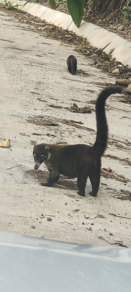 Bis zu unserer Unterkunft sind es noch 30 Minuten zu fahren. Die Strasse ist kurvenreich und erinnert an beliebte Motorradrouten durch die Vogesen. Nur deutlich grüner und wärmer, versteht sich. Unterwegs treffen wir Gruppen von Nasenbären an, die am Strassenrand herumtollen. Lydia schlägt nach: Weissrüssel-Nasenbären.