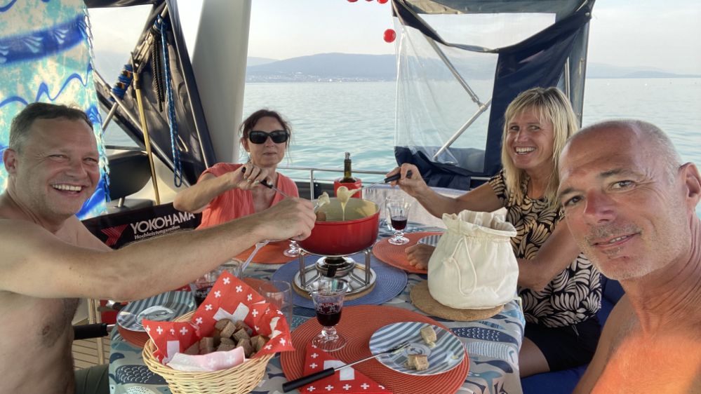 Fondüüüüü Die Nacht verspricht, ruhig zu bleiben. Deshalb bleiben wir für die Übernachtung auch draussen vor Anker. Langweilig.