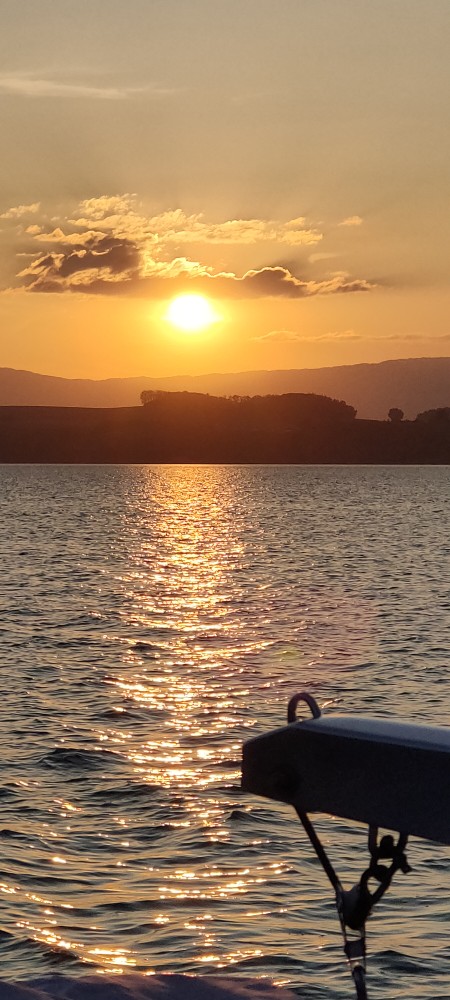 Gegen Abend überqueren wir den See wieder in die entgegengesetzte Richtung und machen an unserem Hafenplatz fest. Das bedeutet übrigens eine garantierte Landstrom-Verbindung, was bei unseren gebeutelten Batterien durchaus von Vorteil ist.