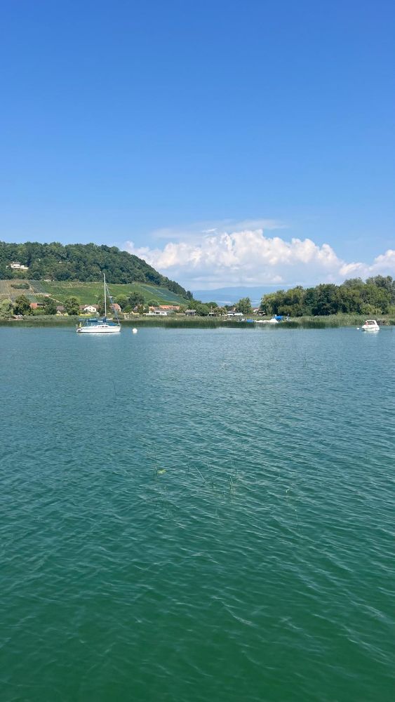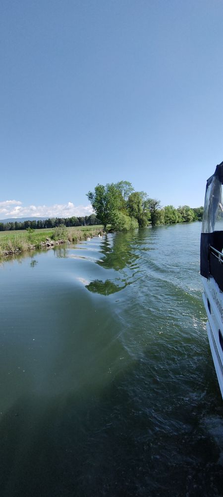 Nach einem Morgenbad ziehen wir den Anker hoch und nehmen Kurs nach Norden. Auf Höhe des Ortes Cudrefin legen wir nach rund einer Stunde Fahrt einen Stopp ein. Noch ist nicht viel Schiffsverkehr, sowohl die Wasseroberfläche als auch die Geräuschkulisse ist angenehm ruhig. So dümpeln wir gemütlich dahin und geniessen ein leckeres Frühstück aus Müsli, Brot, Käse, Salami und Hobelfleisch.