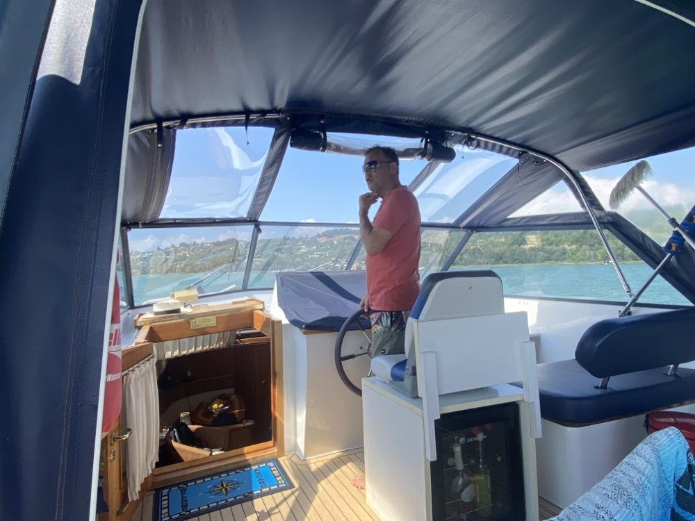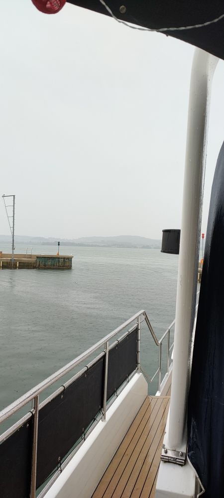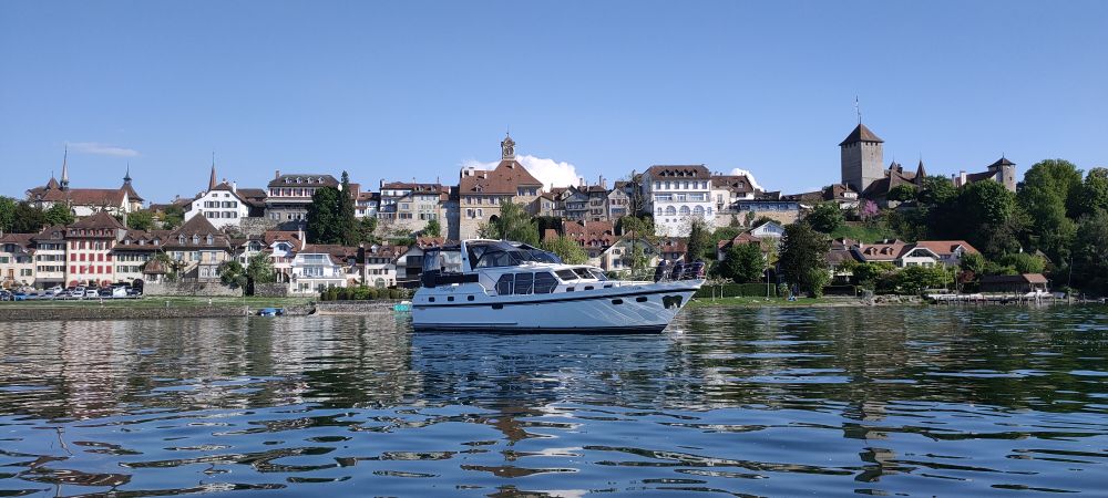 Unser Ziel ist deshalb der Hafen von Auvernier, südwestlich der Stadt Neuchâtel gelegen und ziemlich genau 1 Stunde Fahrt vis-à-vis von unserem Standort entfernt. Der See ist aufgewühlt, Wellen schlagen gegen unseren Rumpf und wegen des kühlen Windes behalten wir die Blachen auf dem Achterschiff geschlossen.