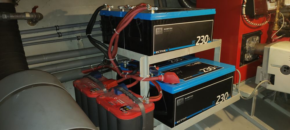 Der Chef persönlich nimmt sich der Sache an. Zuerst überprüft er mittels Fön und Batteriemonitor die Durchhaltefähigkeit der Batterien, die er nach mehreren Minuten als einwandfrei beurteilt. Die elektrischen Anschlüsse im Maschinenraum hingegen gefallen ihm nicht so. Sie sind per Schraubverbindung ausgeführt und weisen an der einen oder anderen Stelle leichte Korrosion auf. Wir vereinbaren einen Termin am Mittwoch, um alle Anschlüsse mit Kabelschuhen versehen zu lassen. Noch geben wir unsere Batteriebank nicht verloren.