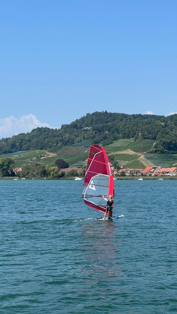 Ein paar verirrte Regentropfen versuchen uns einzuholen, doch sie haben keine Chance. Wir fahren der hinter uns aufziehenden Gewitterfront einfach davon. Bis wir den Murtensee erreichen. In seiner Länge etwa so gross wie der Neuenburgersee an seiner grössten Breite. Das Städtchen Murten liegt an seinem Ostufer und genau davor gehen wir gepflegt vor Anker. Die Sonne brennt und wir geniessen das eine oder andere Bad im kühlen Nass. Naja, meistens.