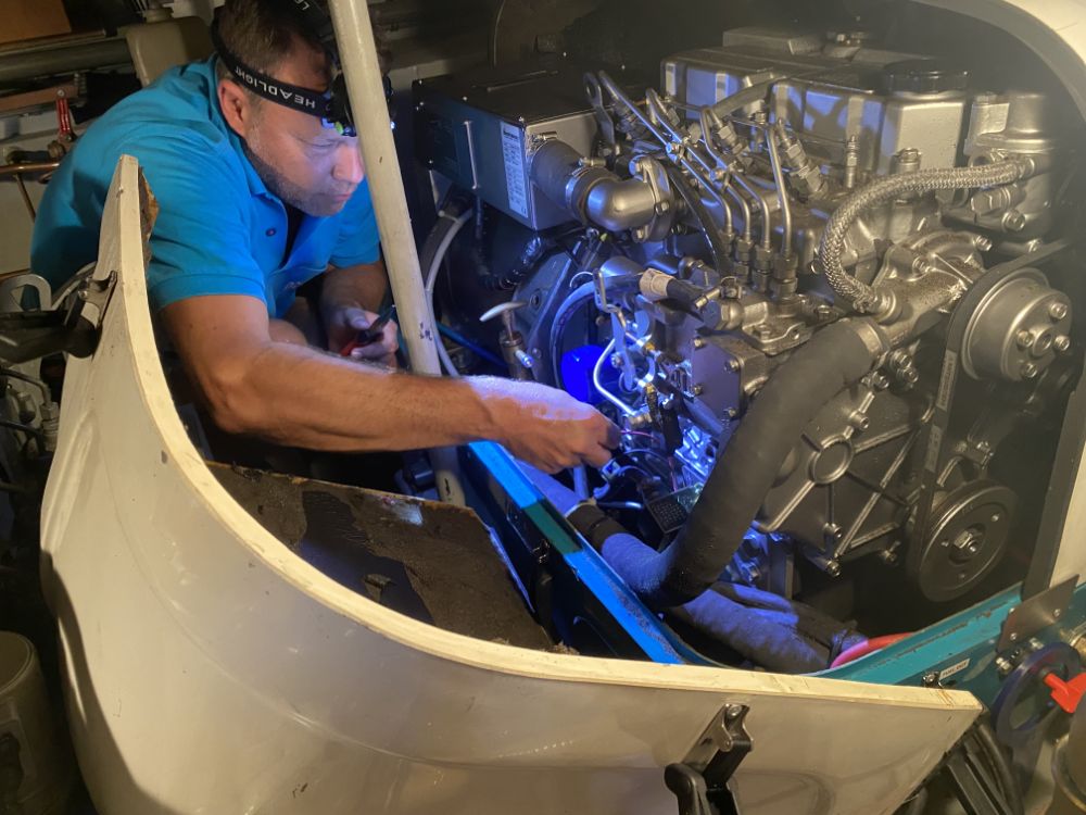 Ich fachsimple mit Ingo über Bordtechnik und erzähle ihm die lustige Geschichte, wie einmal vor einiger Zeit unser Generator ausgefallen ist. Keine 5 Minuten später rufen unsere Liebsten von der Kombüse her hoch, dass soeben der Generator ausgefallen ist. Stirnlampe auf, kriech kriech…