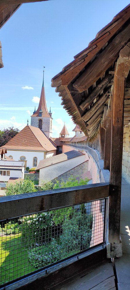 Es ist viel los im Murtener Stedtli. Jedes Restaurant ist gut besucht, der Touristenzug ist unterwegs, 2 Pferdegespanne ziehen an uns vorbei, die Töfflibuebe knattern auf ihren Mopeds durch die Strassen und ein bunt gekleideter Tross von Männern feiert vermutlich Junggesellenabschied.