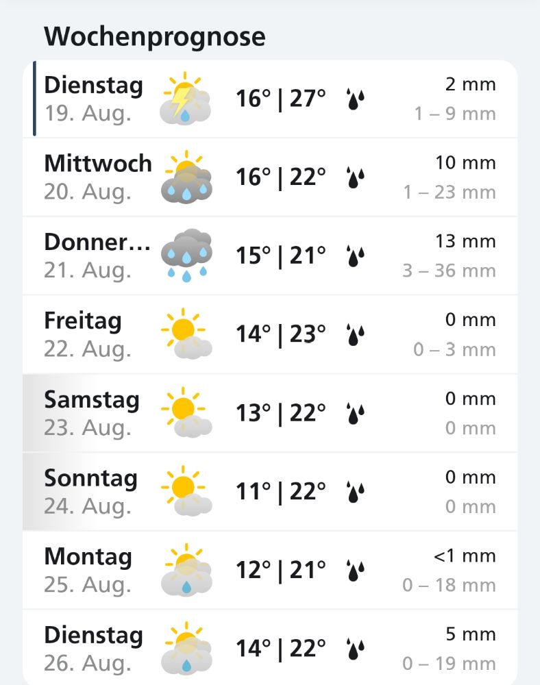 Das war’s dann mal mit dem Sommer. Mit dem nächtlichen Regen sind die Temperaturen um gute 10 Grad gepurzelt. Der Himmel ist verhangen, es herrscht ein kräftiger Wind von Südwesten und irgendwie ist uns nicht danach, in Badekleidung herumzuhängen.