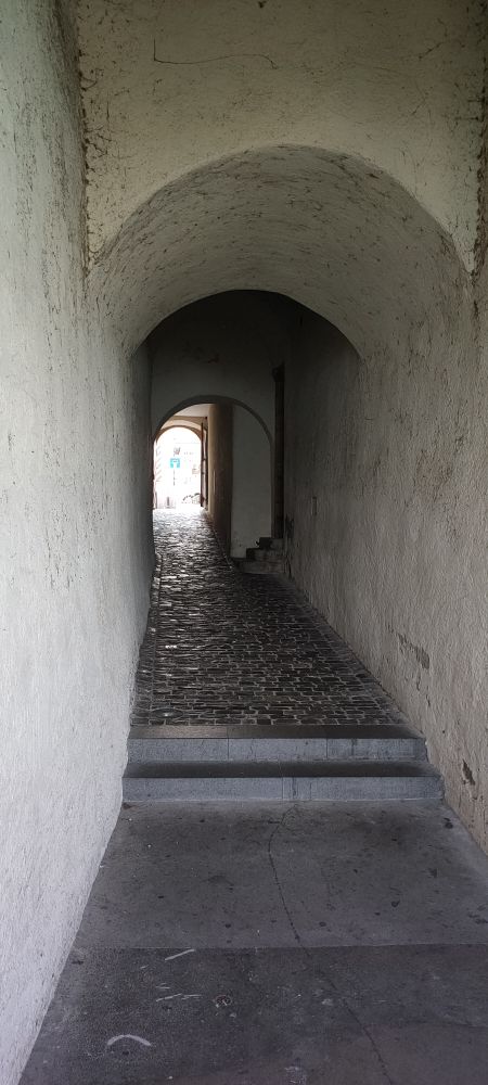 Kurz darauf machen wir im Barkenhafen fest. Zu Fuss geht die Reise weiter. Ohne Fleiss kein Preis, wir müssen eine stramme Treppe und einen Tunnel durch die äussere Stadtmauer bezwingen, schon stehen wir in den kopfsteingepflasterten Gassen zu Murten. Auf diese Strapazen hin gönnen wir uns zuerst einmal auf der Terrasse des Cafés Monnier einen Cappuccino und ein Gipfeli.