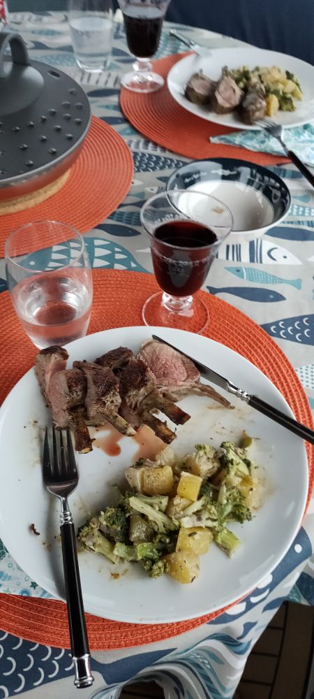 Auch im Hafen lässt es sich prima chillen Gegen 18 Uhr setzt der erste Regen ein. Kein Problem für uns, das gesamte Heck ist rundherum mit Blachen verschlossen und der Grill steht auch schon parat. Das Protokoll sieht vor: zuerst der Apéro, dann sorgfältiges Angrillen mit Scampi und Jakobsmuscheln, danach Übergang zum Hardcore-Grillen mit dem bereits erwähnten Lammrack. So zelebrieren wir unser zNacht, während die Regentropfen auf unser Verdeck prasseln.
