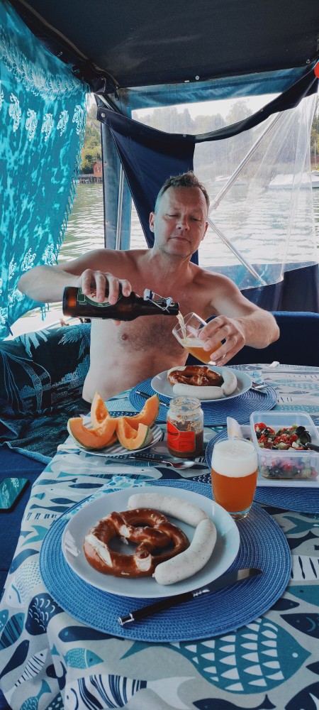Wenigstens ist es vor Regen geschützt. Wir beladen unser Dinghy mit unseren Besorgungen und schippern zurück zum Mutterschiff. Jetzt erstmal Frühstück! Es gibt Bayrische Weisswurst mit süssem Senf und Weissbier. Einige der Mitbringsel unserer Gäste, seeehr lecker. Die frischen Brez’n dazu stammen von unserem Einkauf eben.