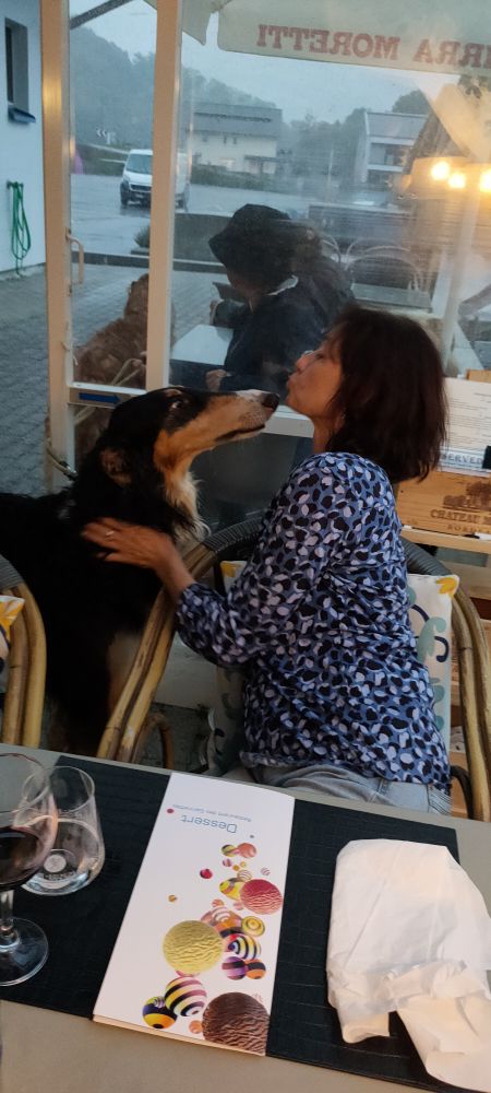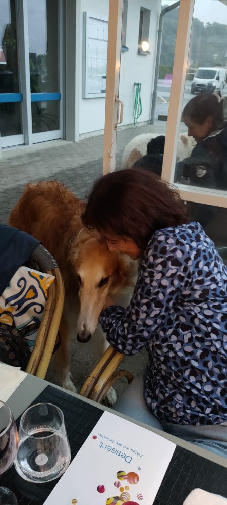Durch den Regen kommen zwei Frauen mit ihren 4 Barsoi-Windhunden herbeispaziert und legen eine Pause im gedeckten Aussenbereich des Restaurants ein. Die Tiere sehen aus wie Langhaar-Dackel auf Stelzen und sind sehr anhänglich. Zwei versuchen ihr Glück bei Lydia und werden zur Belohnung ausgiebig geknuddelt. Zu Lydias Belohnung riechen ihre Hände danach nach nassem Hund.