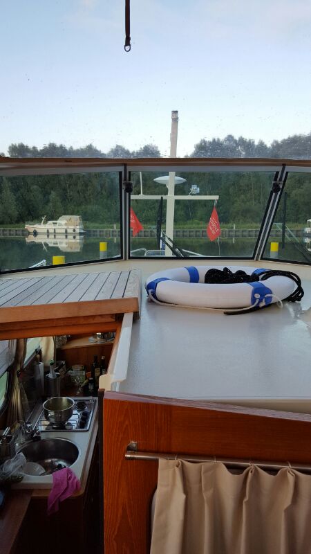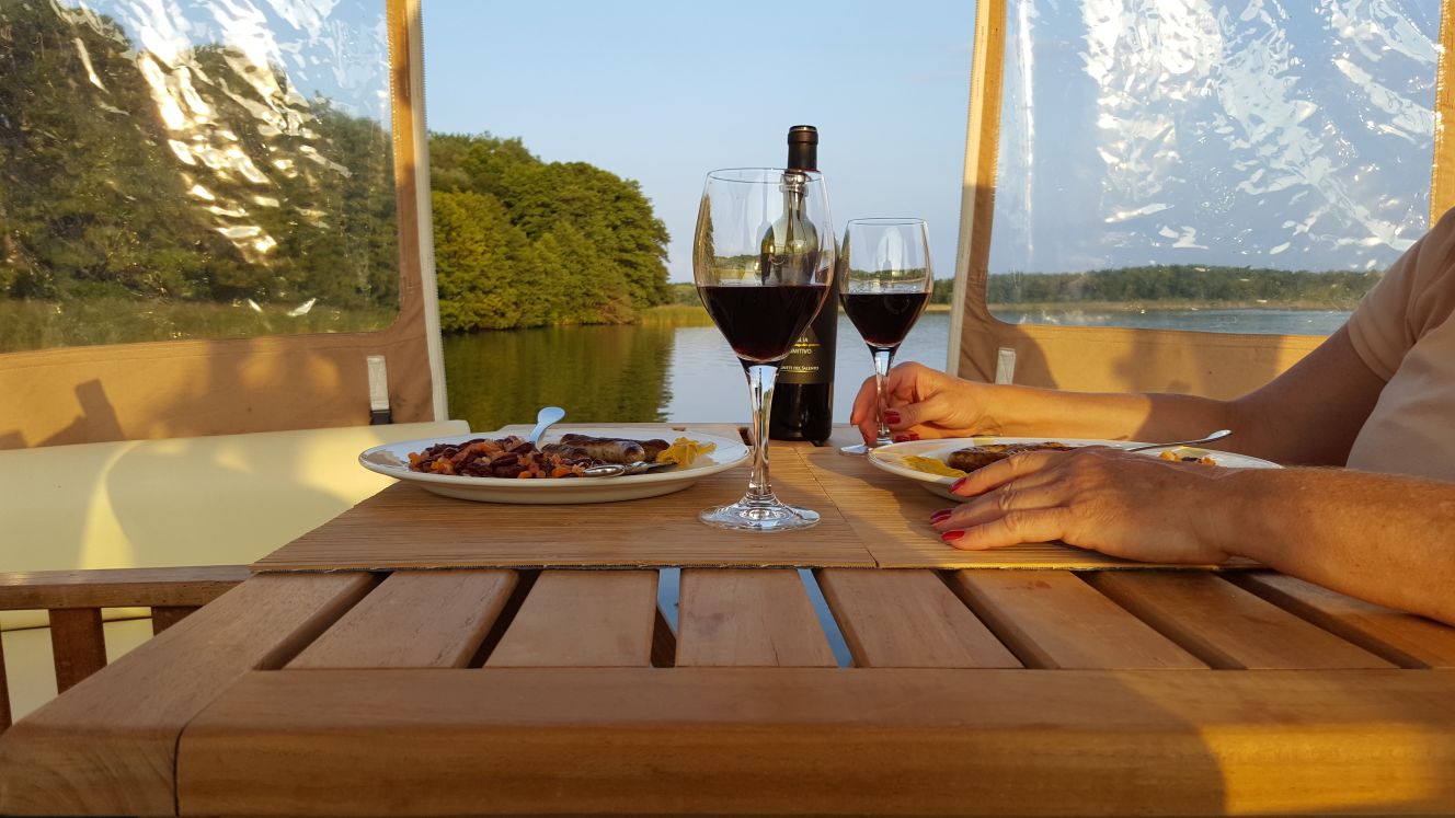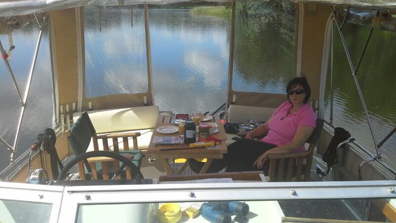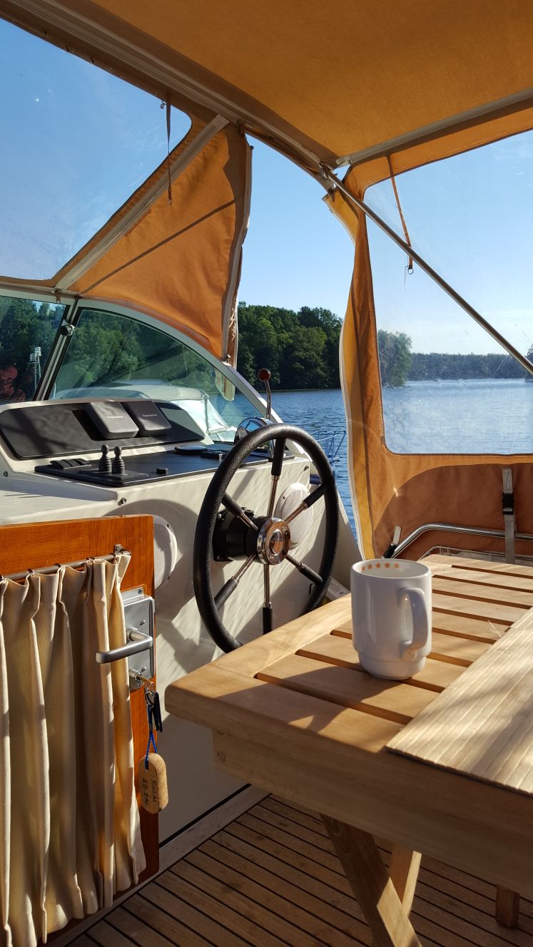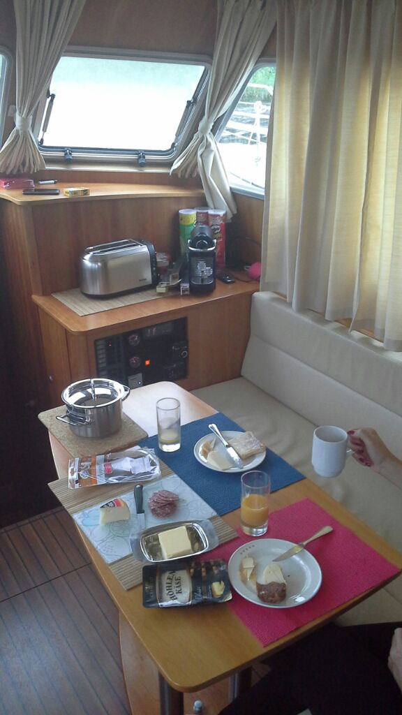 Frühstück unter Deck Gleichzeitig entschieden wir, dass wir uns heute nur eine kurze Fahrt nach Fürstenberg und dafür einen entspannten Tag genehmigen. Überdies kamen wir überein, unser ursprüngliches Ziel – Plau am See – zu streichen. Die Strecke ist einfach zu lang, um die damit verbundenen Tagesfahrleistungen noch als «Urlaub» durchgehen zu lassen.