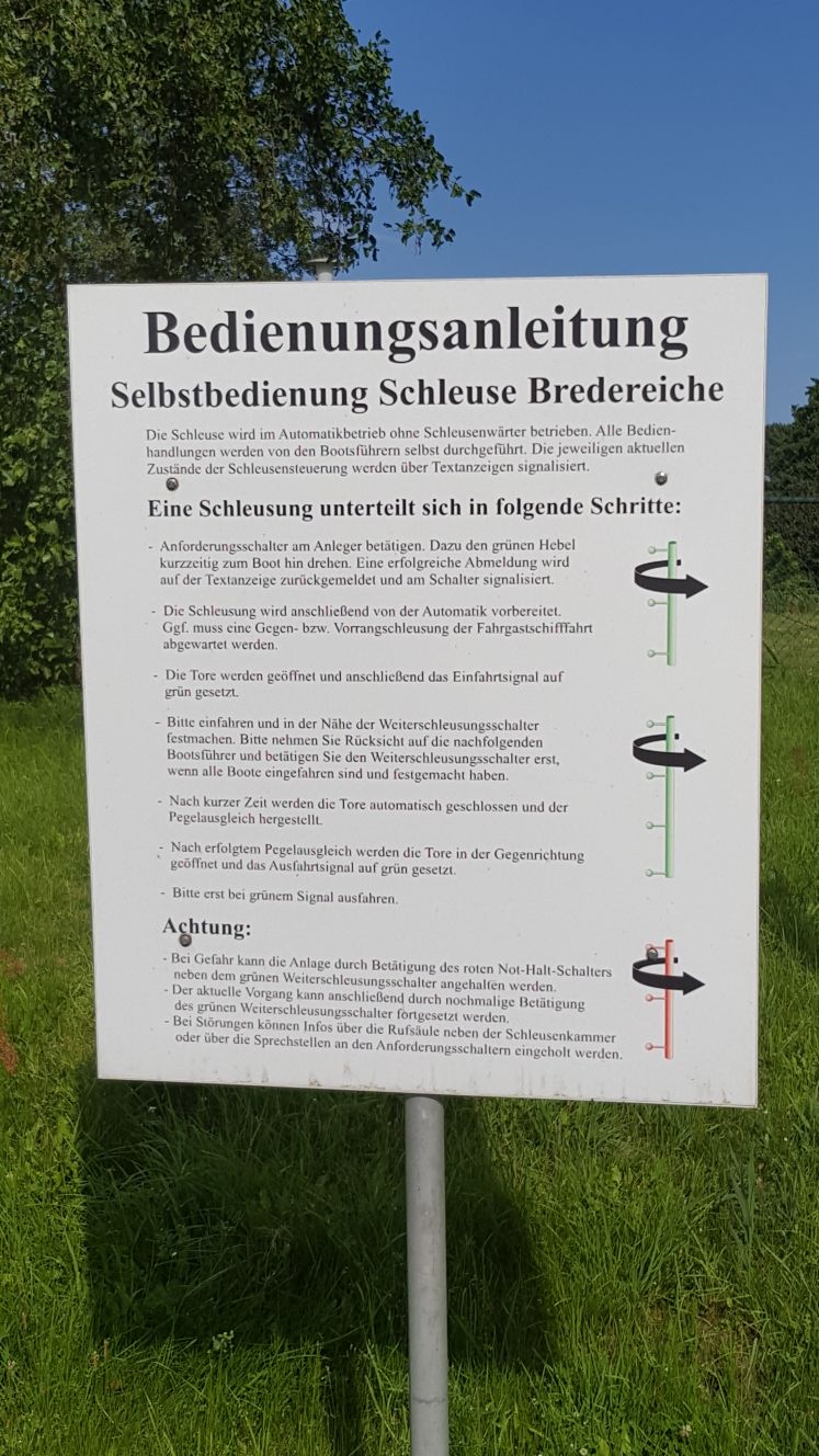 Bei strahlendem Sonnenschein legten wir in der Marina Fürstenberg ab. Es lagen 22km und 4 Schleusen vor uns, also ein strammes Tagesprogramm. Das Frühstück verlegten wir auf später, um so schnell wie möglich die ersten beiden Schleusen hinter uns zu bringen. Das gelang uns schon bei der ersten, der Schleuse Fürstenberg, überhaupt nicht. Ein vor uns fahrendes Boot muss die Schleusung gestartet haben, bevor wir in Sichtweite waren. So mussten wir über eine halbe Stunde warten.