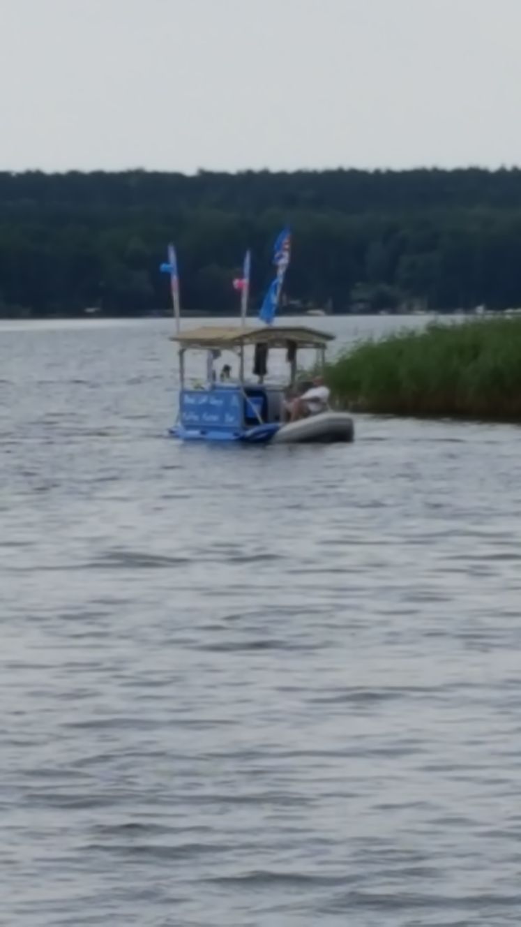 Ein Glacéstand/Würschtlibude auf dem Wasser Die letzte Schleuse Wolfsbruch liess uns nochmal eine halbe Stunde warten (für sage und schreibe 50cm Hub). Gleich danach bogen wir in die gleichnamige Marina ein, wo wir um 17 Uhr mit freundlicher Hilfe unserer zukünftigen Platznachbarn anlegten.