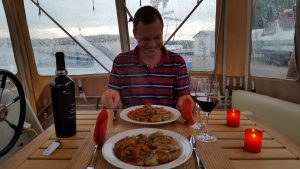 Eigentlich wollten wir im Restaurant essen, schliesslich lag der örtliche Italiener nur 20 Schritte von unserem Boot entfernt. Leider war kein Tisch mehr frei. Aber statt selbst den Kochlöffel zu schwingen, bestellten wir zweimal Linguini auf unser Boot. Die Teller drückte man uns einfach im Restaurant in die Hand. Takeaway mal anders.